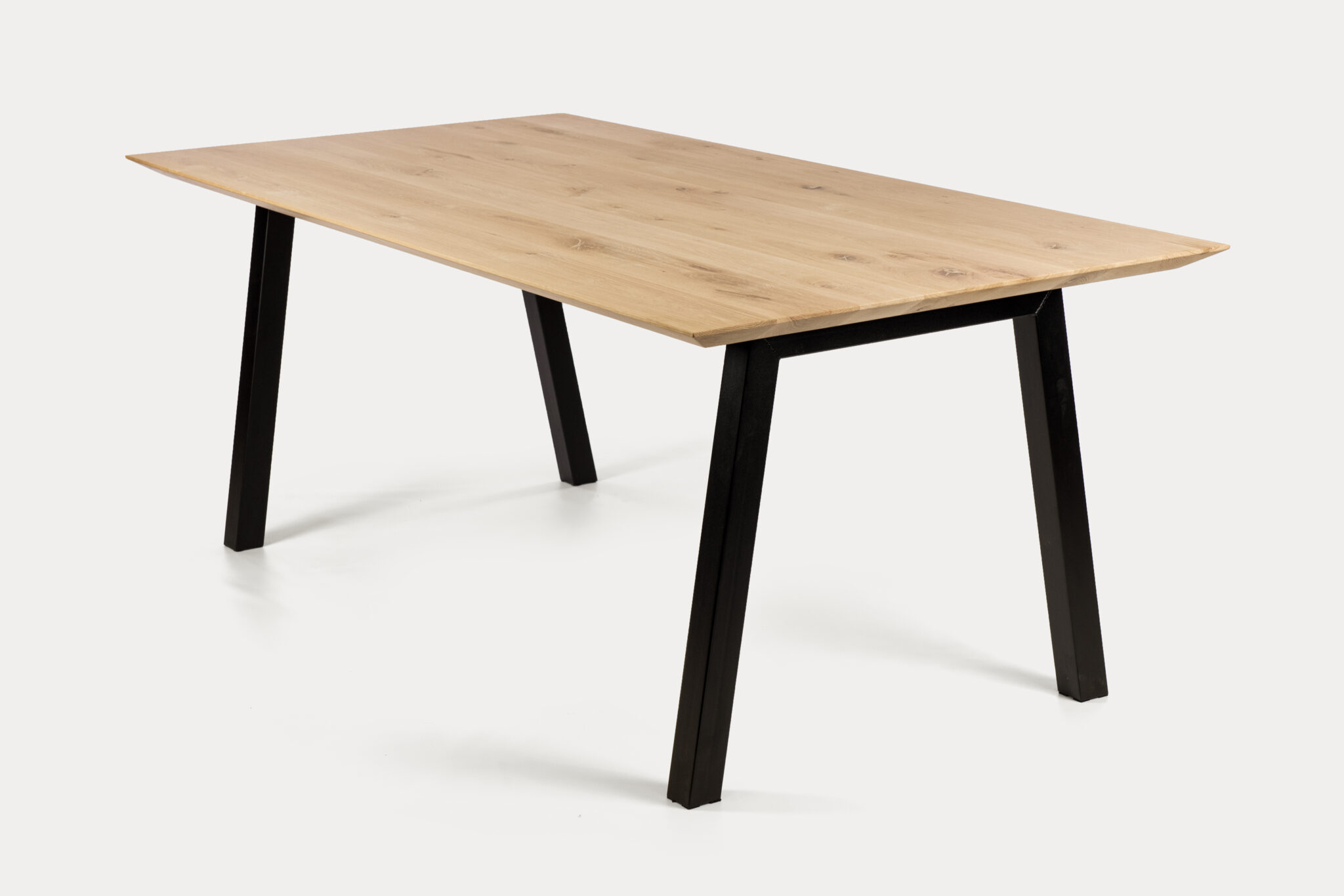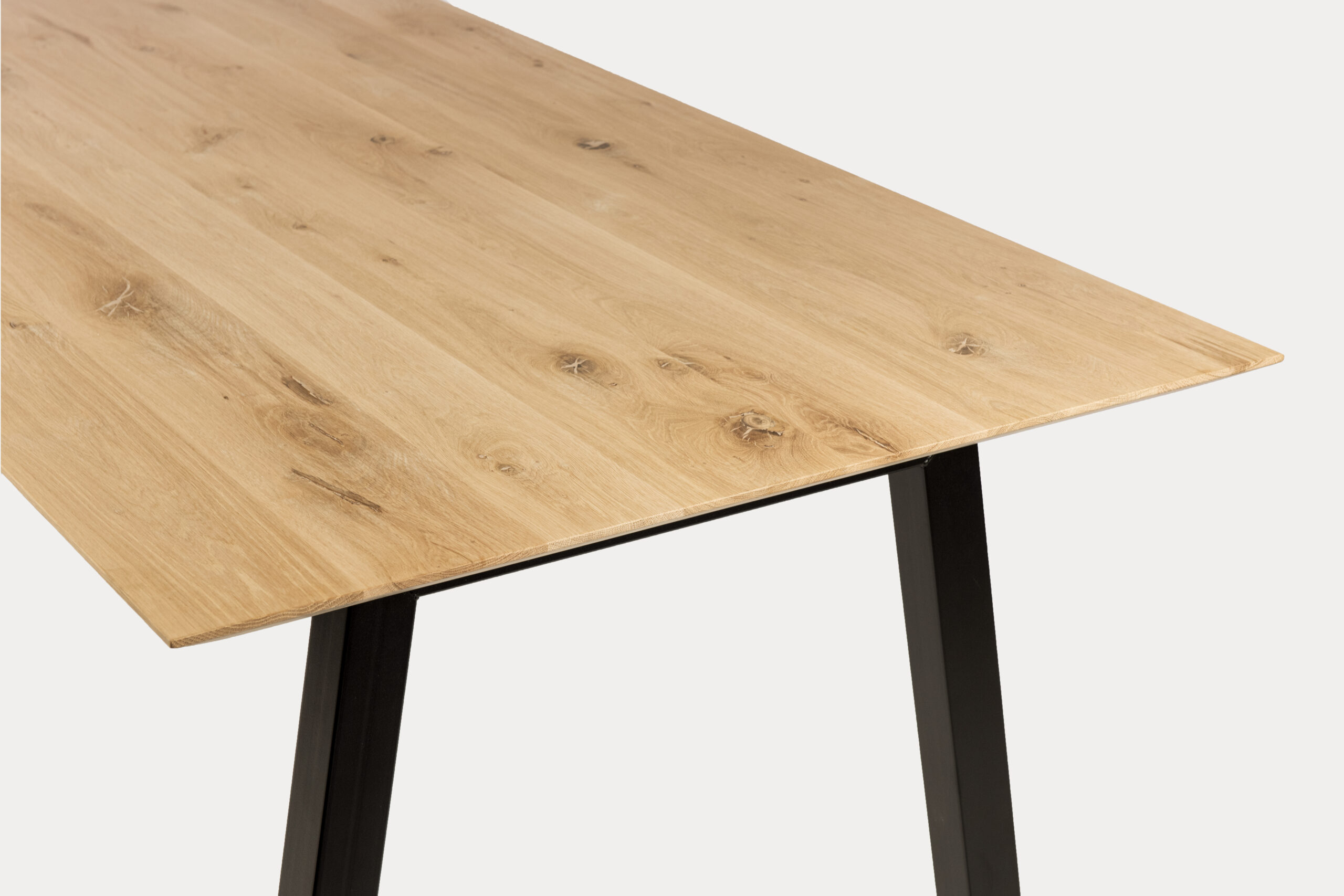 Een massief eiken recht blad in 4cm dat is afgeschuind op 60 graden. Het onderstel is opgebouwd uit 6x6cm gepoedercoat staal.
