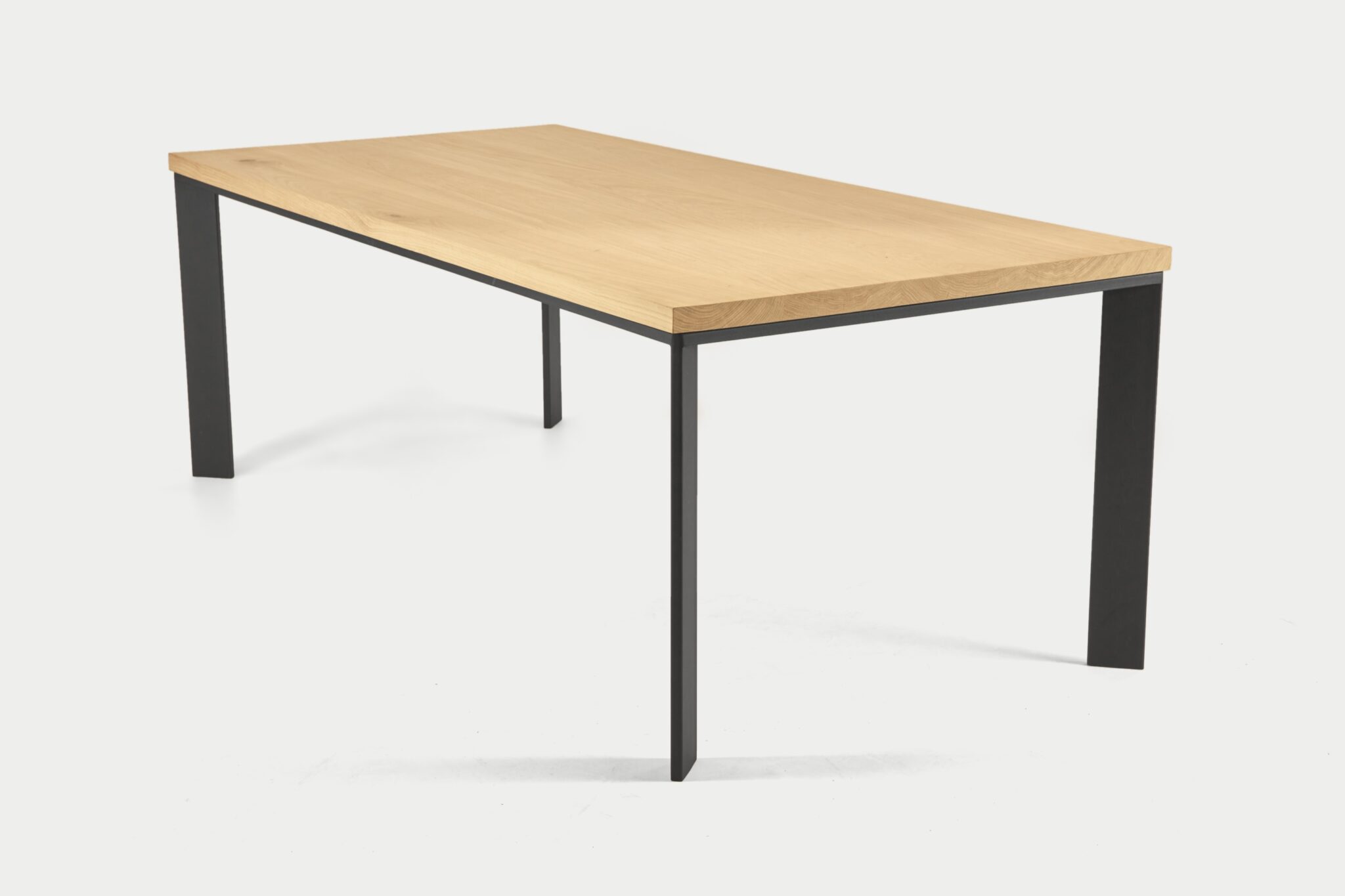 Een massief eiken blad in 4cm in een rechte vorm in combinatie met een gepoedercoat stalen 10x4cm frame.