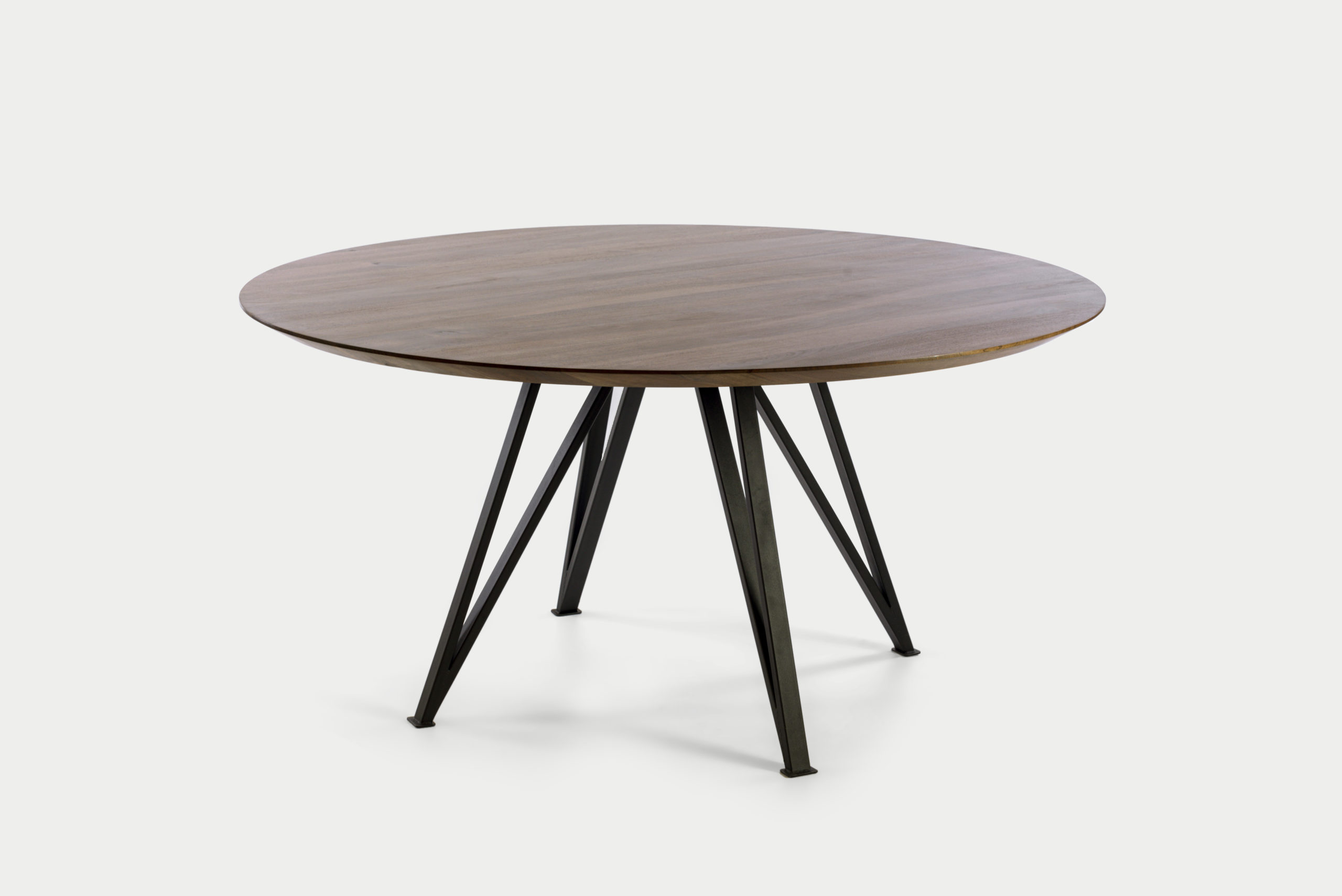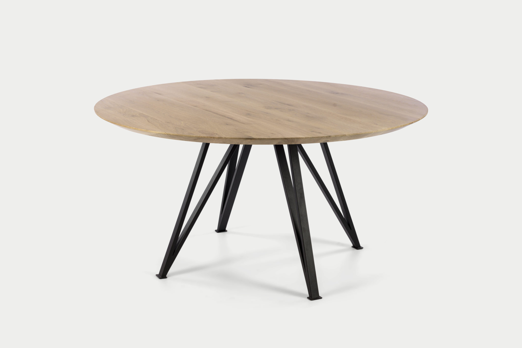 Een massief eiken rond verjongd blad in 4cm. Het onderstel is opgebouwd uit gepoedercoat staal. Het blad is afgewerkt met een beschermende lak/olie. Daarnaast is het blad aan de onderkant uitgerust met in gefreesde metalen strips die het blad recht houden en kromtrekken tegengaan.